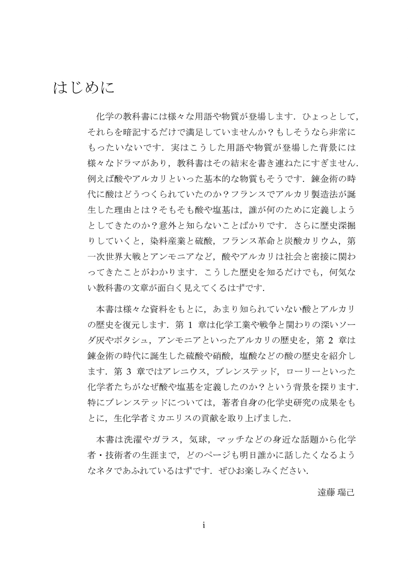 第1章は化学工業や戦争と関わりの深いソーダ灰やポタシュ,アンモニアといったアルカリの歴史を,第2章は錬金術の時代に誕生した硫酸や硝酸,塩酸などの酸の歴史を紹介します.第3章ではアレニウス,ブレンステッド,ローリーといった化学者たちが酸や塩基を定義した背景を探ります.特にブレンステッドについては,著者自身の化学史研究の成果をもとに,生化学者ミカエリスの貢献を取り上げました.