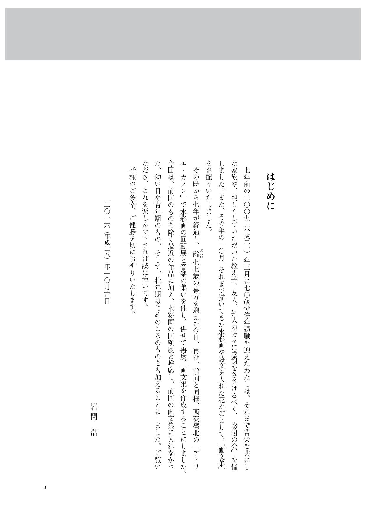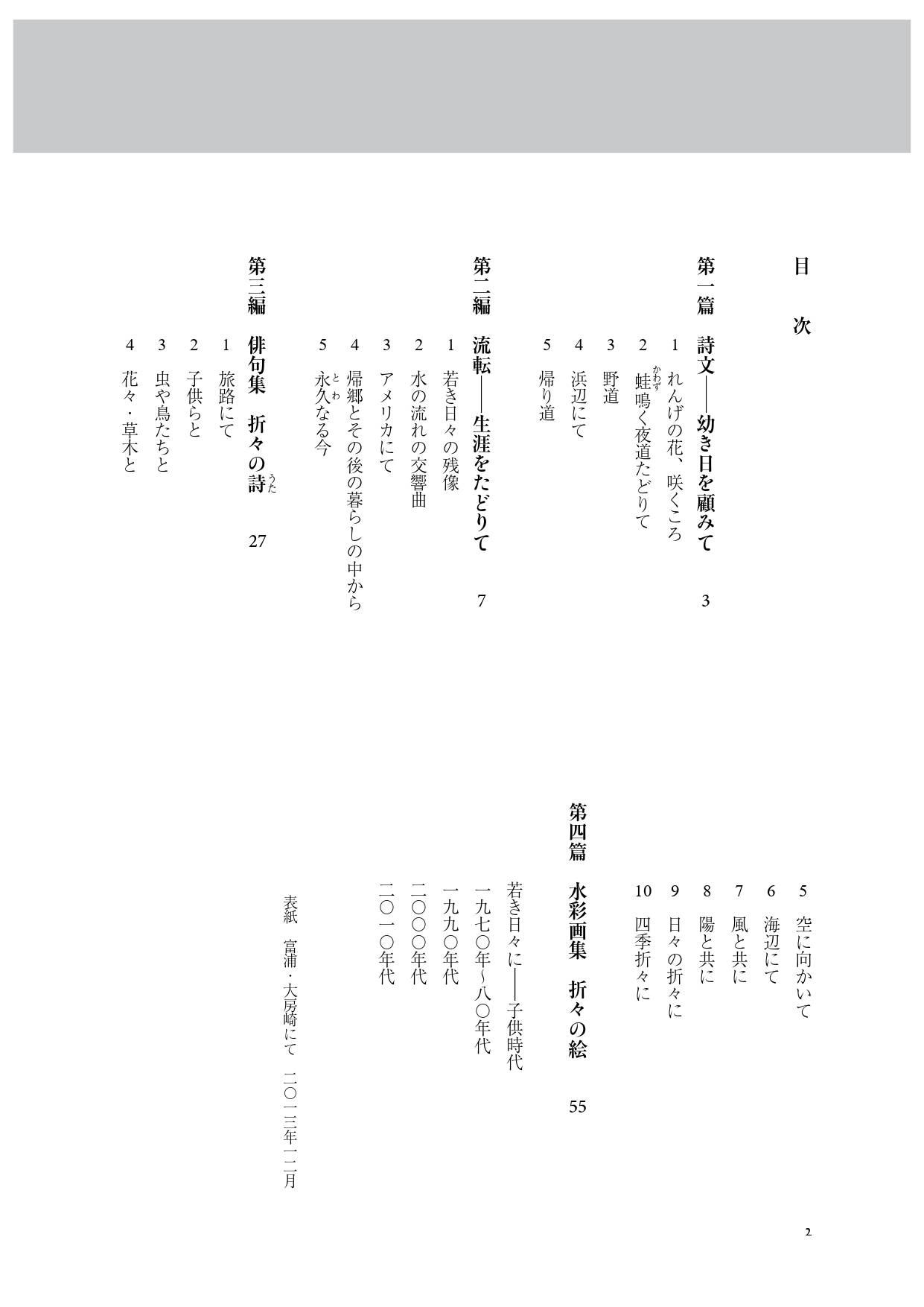 画文集、『岩間浩画文集 折々の詩(うた) 折々の絵 その2』は、2016(平成28)年10月に発行されたもので、定年退職を機会に催した個展などに出品したものに、生涯を振り返り少年期、青年期に描いた絵画をも加えた水彩画集です。これに加え、同じく生涯を振り返る「詩文―幼き日を顧みて」、「流転―生涯をたどりて」に、「俳句集―折々の詩」を加えて構成されています。