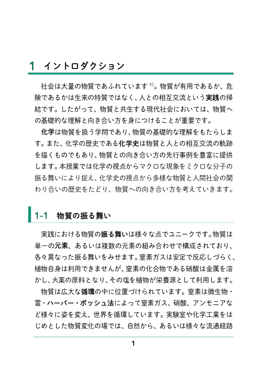 本書『化学と現代社会』は、化学の視点からマクロな現象をミクロな分⼦の振る舞いにより捉え、化学史の視点から多様な物質と⼈間社会の関 わり合いの歴史をたどり、物質への向き合い⽅を学ぶことを目的として執筆されています。
