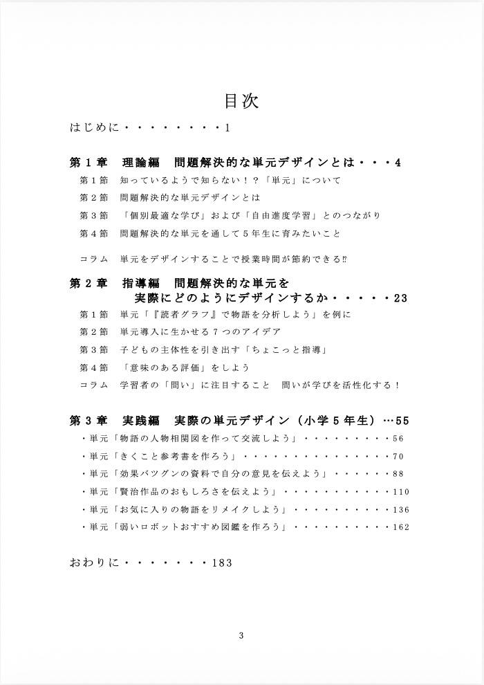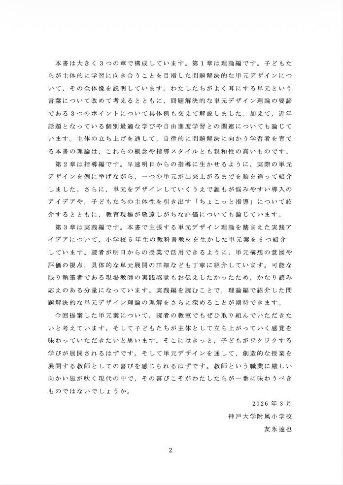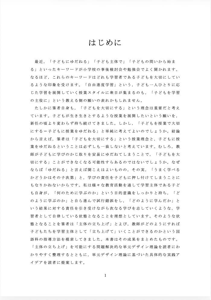 構成は理論・指導・実践の三層になっており、読む目的に応じてどこからでも手が届く設計です。単元とはそもそも何かという問い直しから始まり、学びへの必然性を生み出す導入の工夫、子どもの主体性に火をつける「ちょこっと指導」、意味のある評価のあり方まで。さらに、小学五年生の教科書教材を使った六つの単元案が、構想の意図から評価の視点まで詳細に紹介されており、理論が実践の中でどのように息づくかを、読者自身が追体験できる構成となっています。